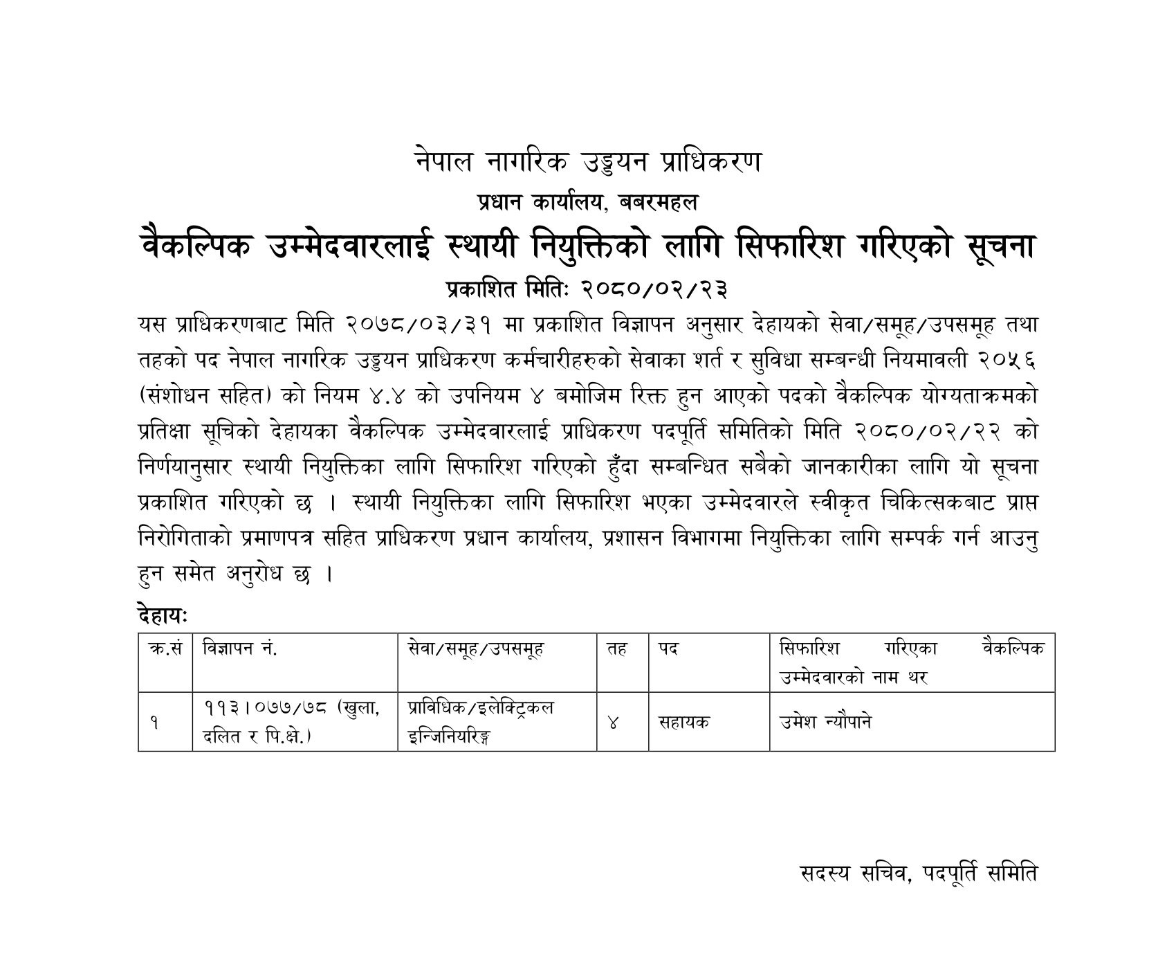 वैकल्पिक उम्मेदवारलाई स्थायी नियुक्तिको लागि सिफारिश गरिएको सूचना