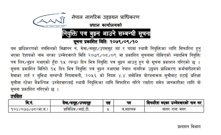 वि.नं.१०४/७७/७८ (आ.ज.) नियुक्ति पत्र बुझ्न आउने सम्बन्धी सूचना