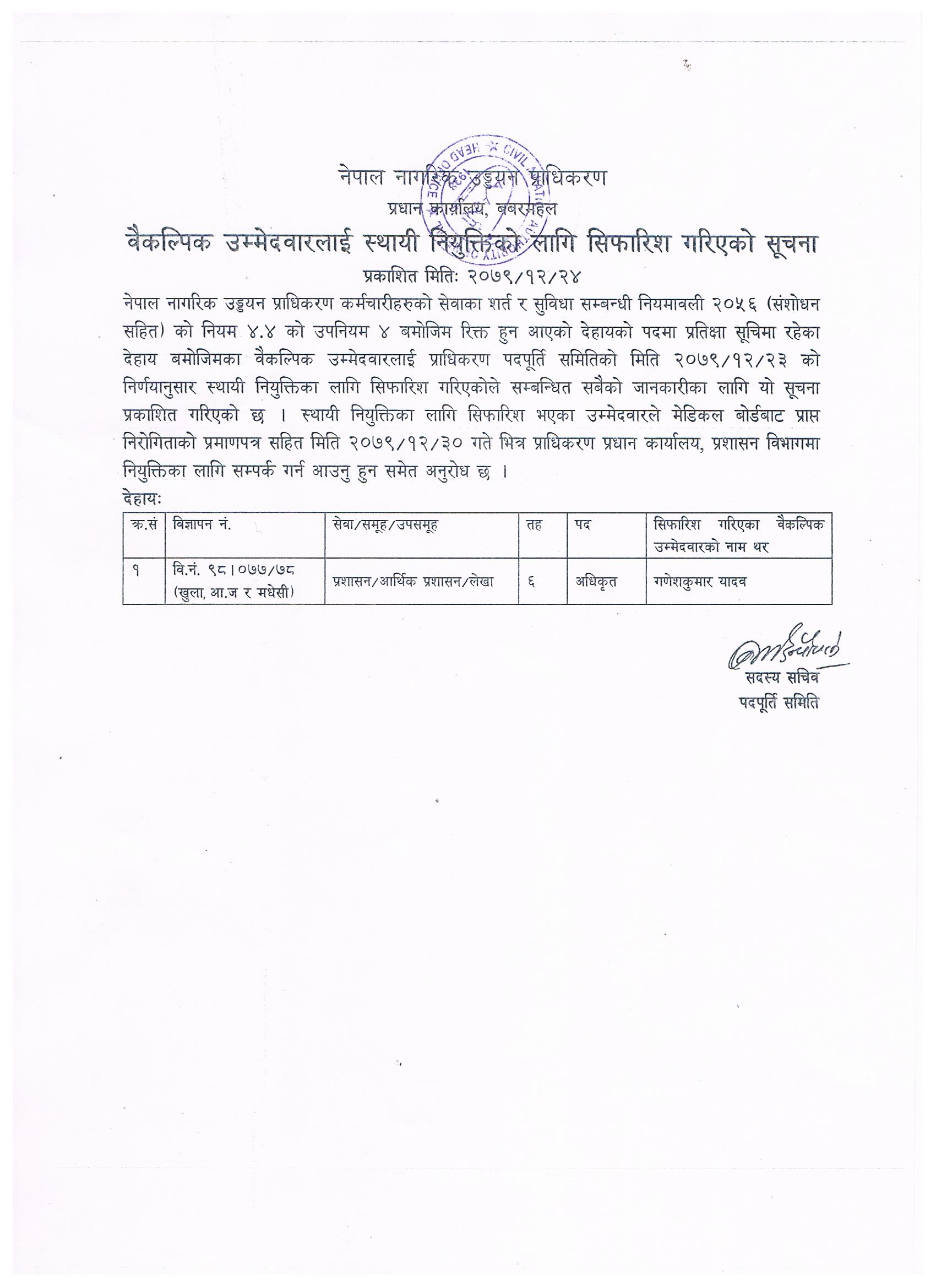 वैकल्पिक उम्मेदवारलाई स्थायी नियुक्तिको लागि सिफारिश गरिएको सूचना