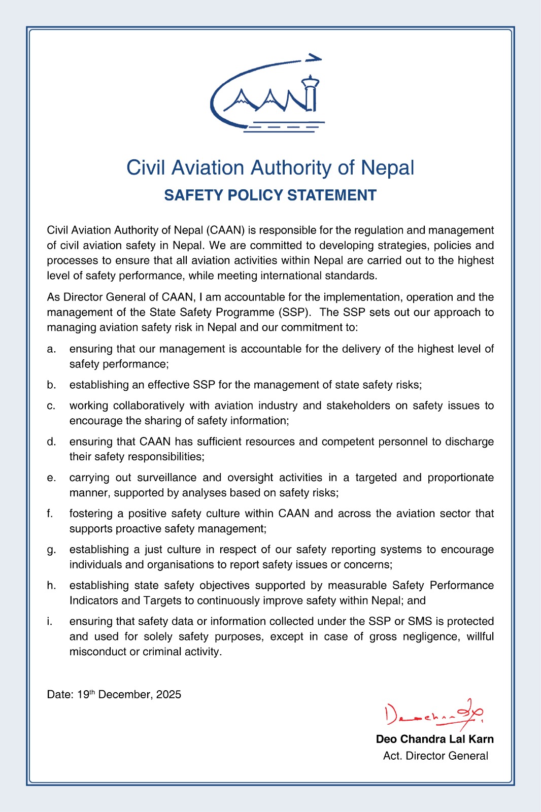 After the adoption of Annex-19, ICAO has mandated that all of its member states implement State Safety Program (SSP) and Safety Management System (SMS) in their aviation industries. CAAN has established Safety Management Division within Civil Aviation Safety Regulation Directorate for the effective implementation of safety management system. This Division is responsible to carry out preliminary work relating to the SSP and coordinate the responsible Departments for the implementation of safety management system. The Division is also responsible to analyze the data received through mandatory information reporting system (MIRS) and voluntary Information reporting systems (VIRS).