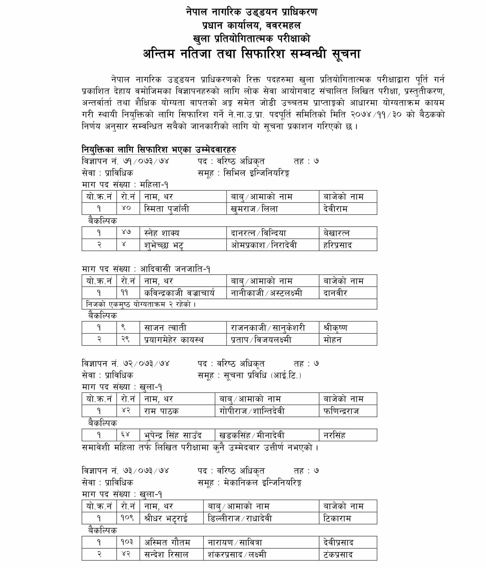 अन्तिम नतिजा तथा सिफारिश सम्वन्धी सूचना वि‍.न. ७१,७२,७३ र ७५ /०७३/७४