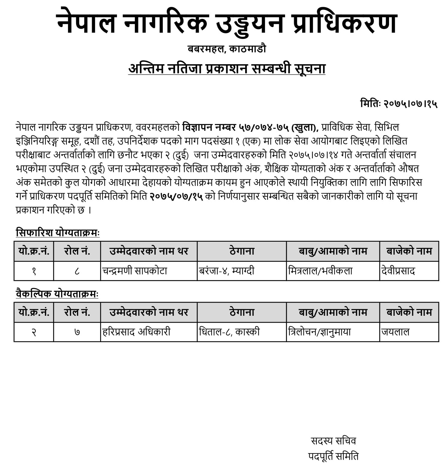 अन्तिम नतिजा प्रकाशन सम्बन्धी सूचना वि.नं. ५७/०७४-७५ (खुला)