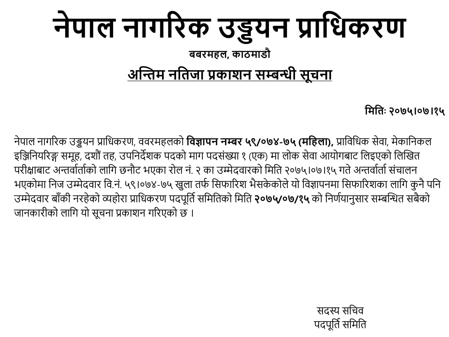 अन्तिम नतिजा प्रकाशन सम्बन्धी सूचना वि.नं. ५९/०७४-७५ (महिला)