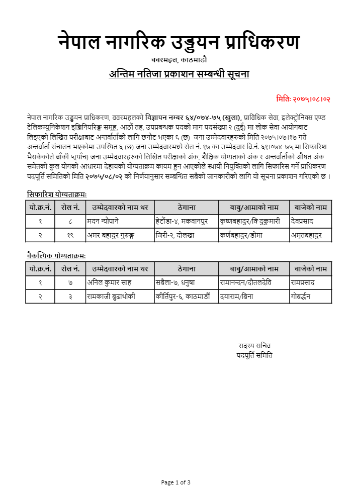 अन्तिम नतिजा प्रकाशन सम्बन्धी सूचना वि.नं. ६४/०७४-७५ (खुला)