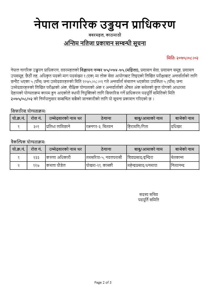 अन्तिम नतिजा प्रकाशन सम्बन्धी सूचना वि.नं. ७५/०७४-७५ (महिला)