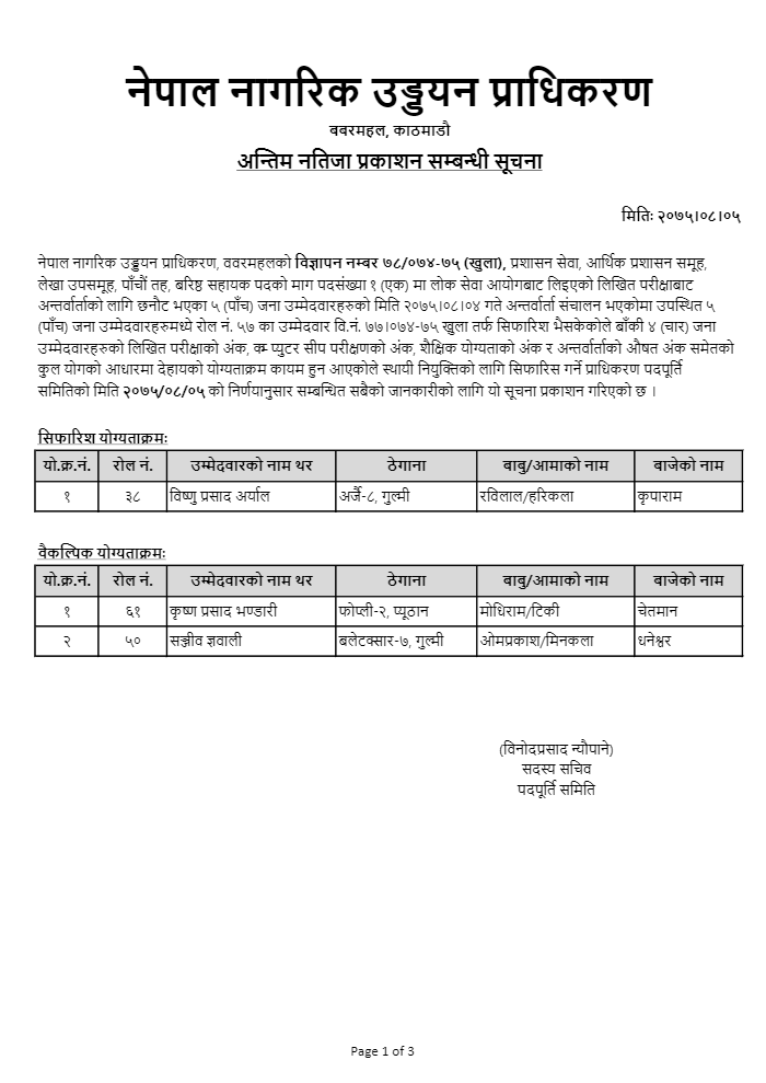 अन्तिम नतिजा प्रकाशन सम्बन्धी सूचना वि.नं. ७८/०७४-७५ (खुला, महिला र एकमुष्ठ)