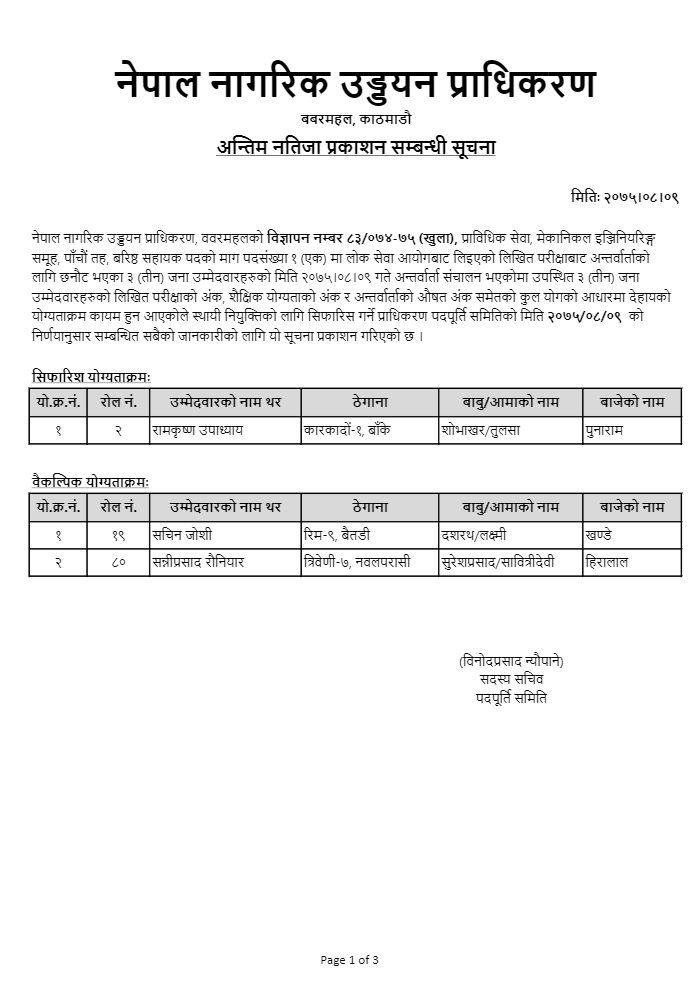 अन्तिम नतिजा प्रकाशन सम्बन्धी सूचना वि.नं. ८३/०७४-७५ (खुला, महिला र एकमुष्ठ)