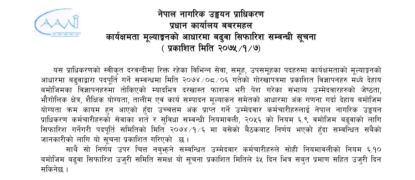 कार्यक्षमता मूल्याङ्कनको आधारमा बढुवा सिफारिश सम्वन्धी सूचना २०७४/१/७