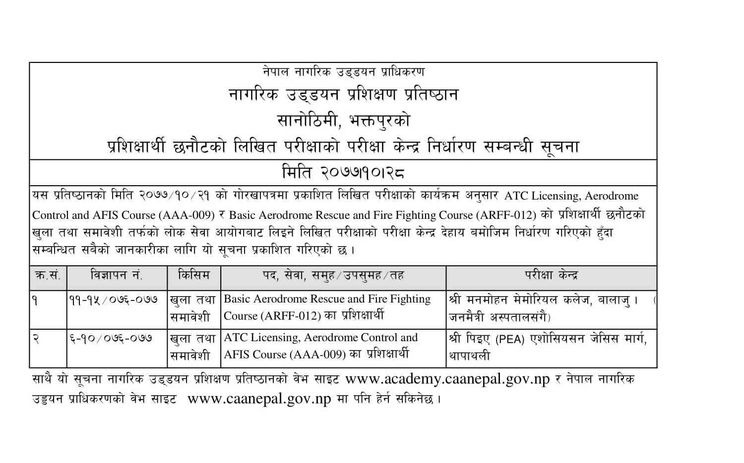 प्रशिक्षार्थी छनौटको लिखित परीक्षाको परीक्षा केन्द्र निर्धारण सम्बन्धी सूचना