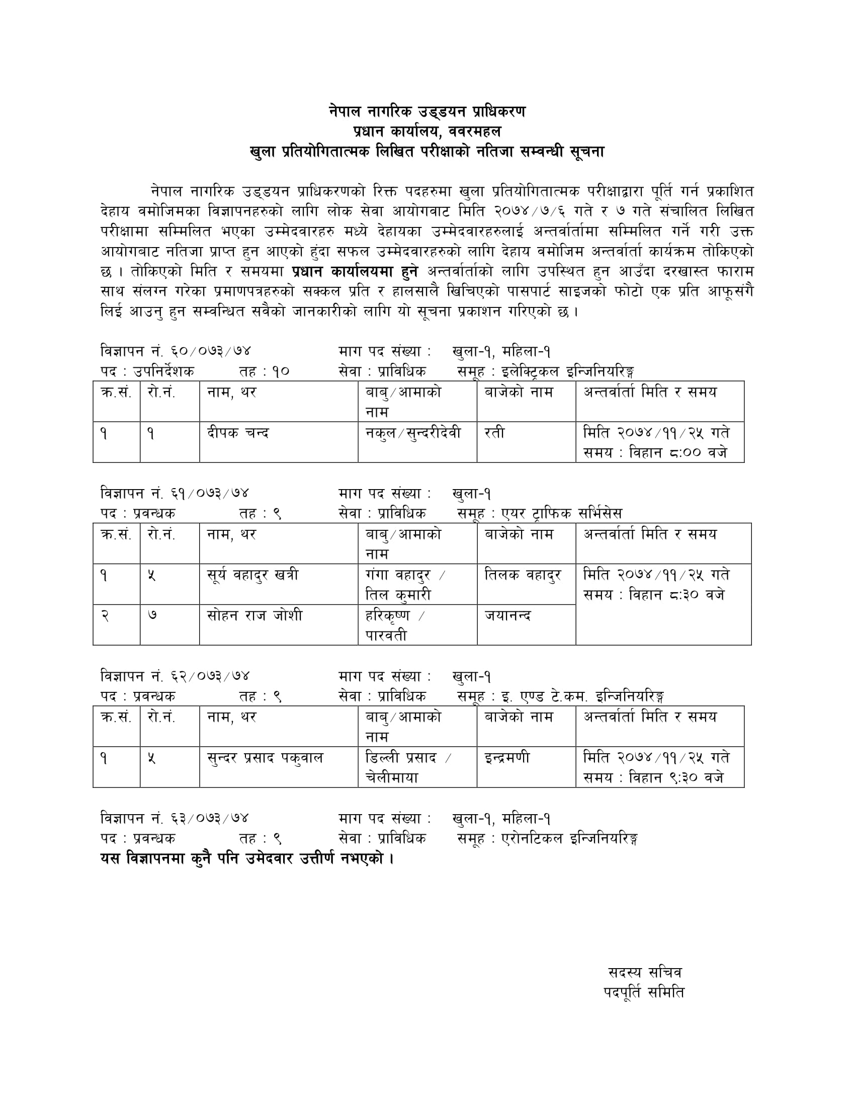 खुला प्रतियोगितात्मक लिखित परीक्षा वि‍.न. ६०-६३/०७३/७४ को नतिजा सम्बन्धी सूचना