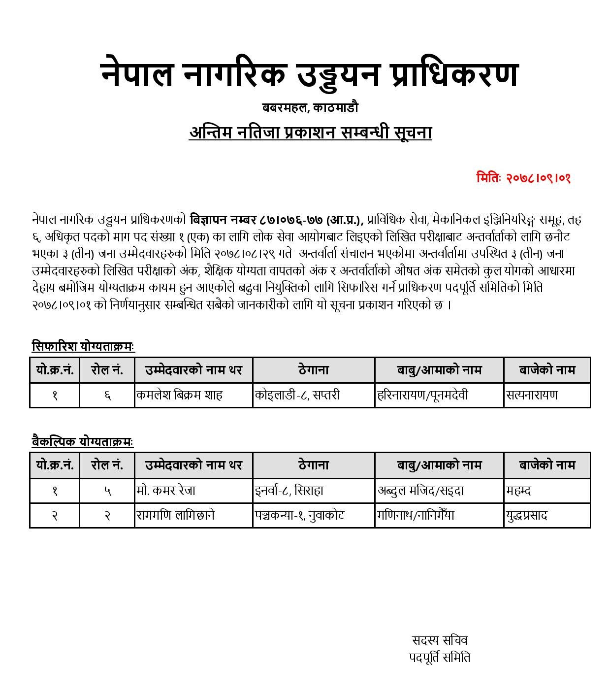 अन्तिम नतिजा प्रकाशन सम्बन्धी सूचना (८७/०७६/७७ )