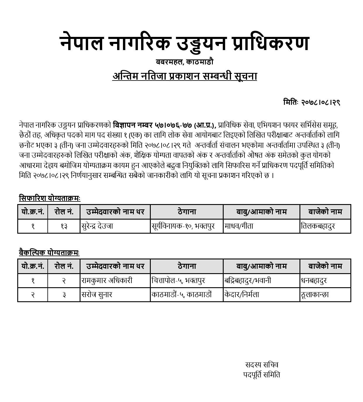 अन्तिम नतिजा प्रकाशन सम्बन्धी सूचना (५७/०७६/७७ )