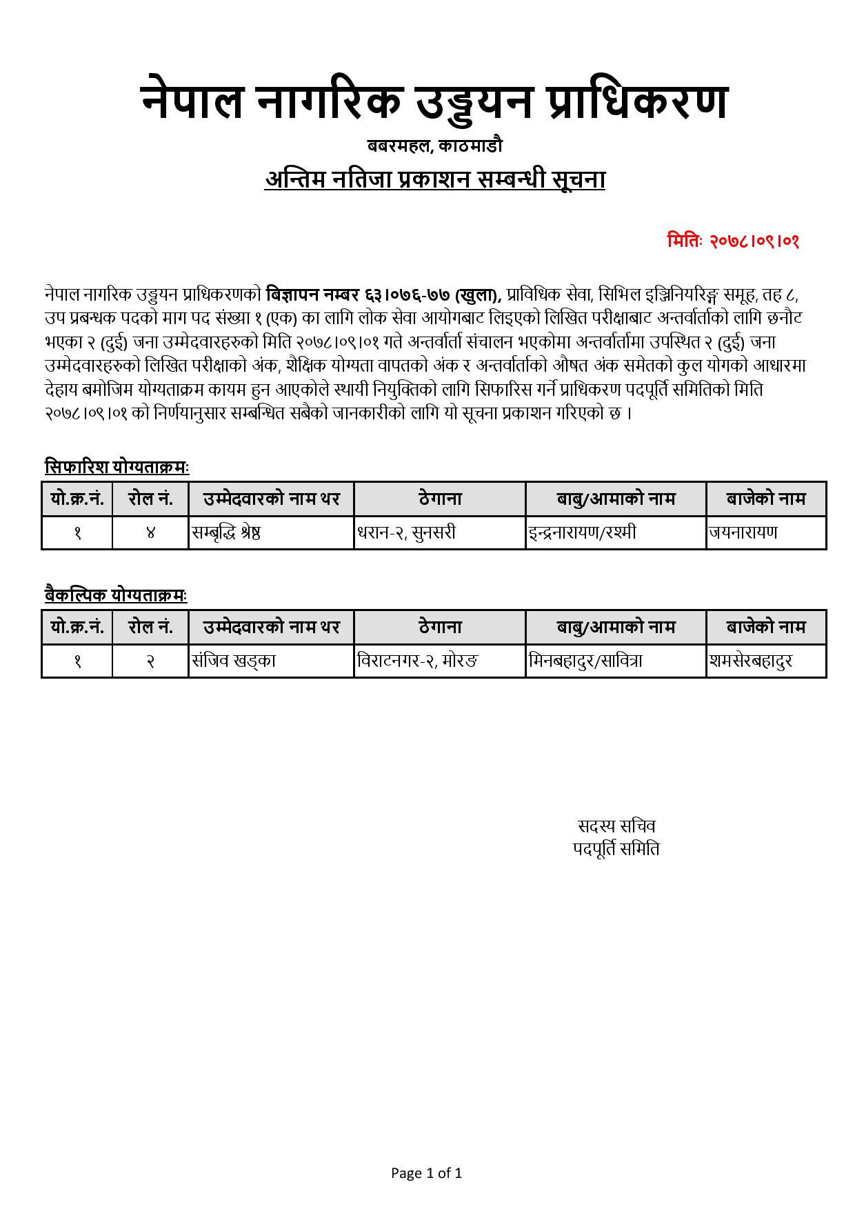 अन्तिम नतिजा प्रकाशन सम्बन्धी सूचना (६३/०७६/७७ )