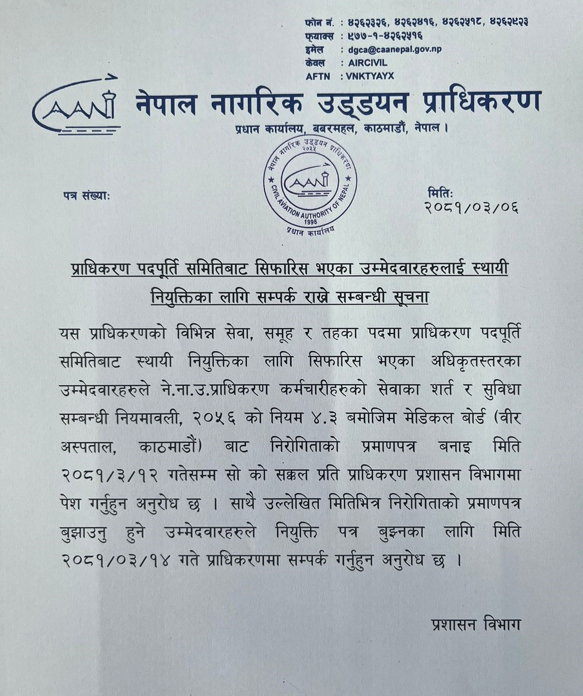 प्राधिकरण पदपूर्ति समितिबाट सिफारिस भएका उम्मेदवारहरुलाई स्थायी नियुक्तिका लागि सम्पर्क राख्ने सम्बन्धी सूचना
