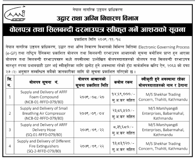 वोलपत्र तथा सिलबन्दी दरभाउपत्र स्वीकृत गर्ने आशयको सूचना