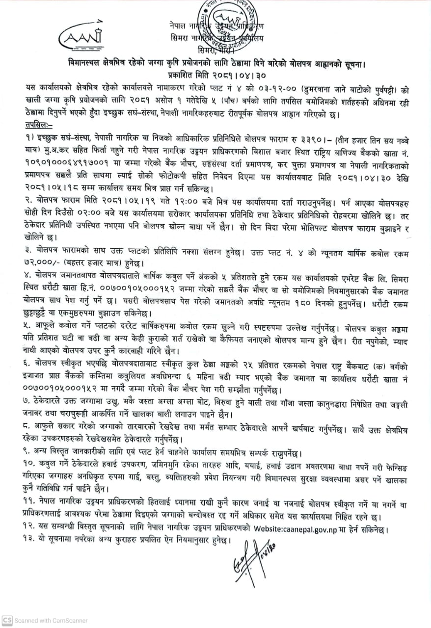विमानस्थल क्षेत्र भित्र रहेको जग्गा कृषि प्रयोजनको लागि ठेक्कामा दिने बोलपत्र सम्बन्धमा (सिमरा ना.उ.का.)
