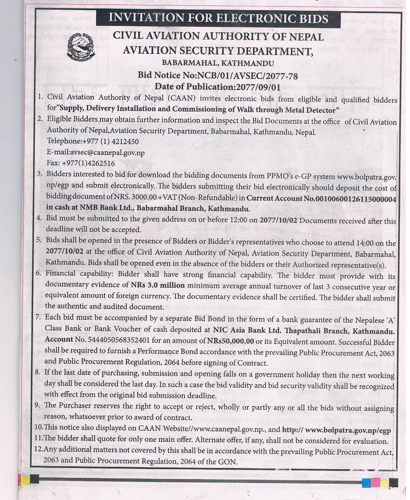 Bid notice No: NCB//AVSEC/2077-78 Aviation Security Department