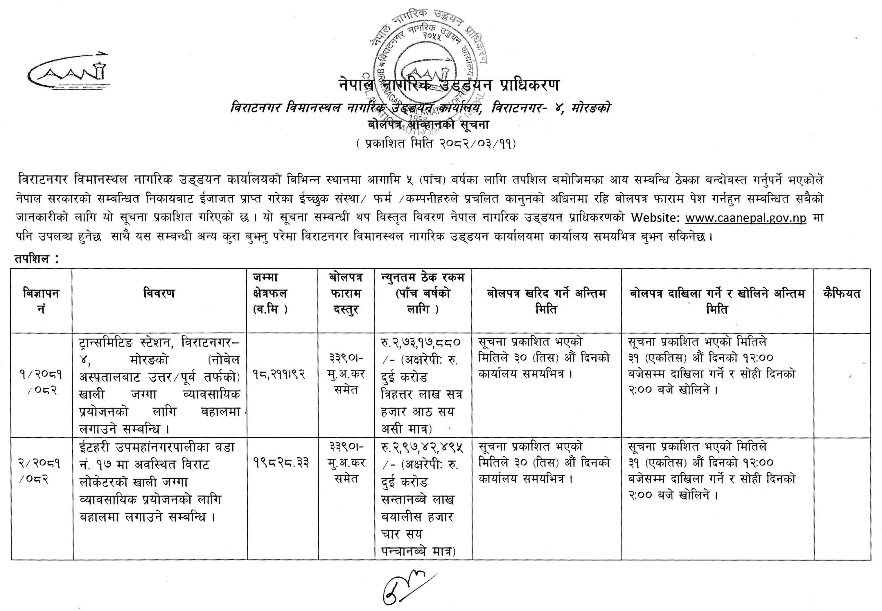 विराटनगर विमानस्थल - खाली जग्गा बहाल सम्बन्धी बोलपत्रको सूचना