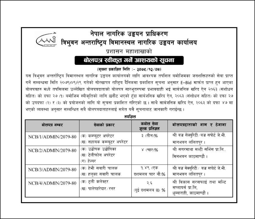 बोलपत्र स्वीकृत गर्ने आशयको सूचना - त्रि‍.अ.वि.ना.उ.का.