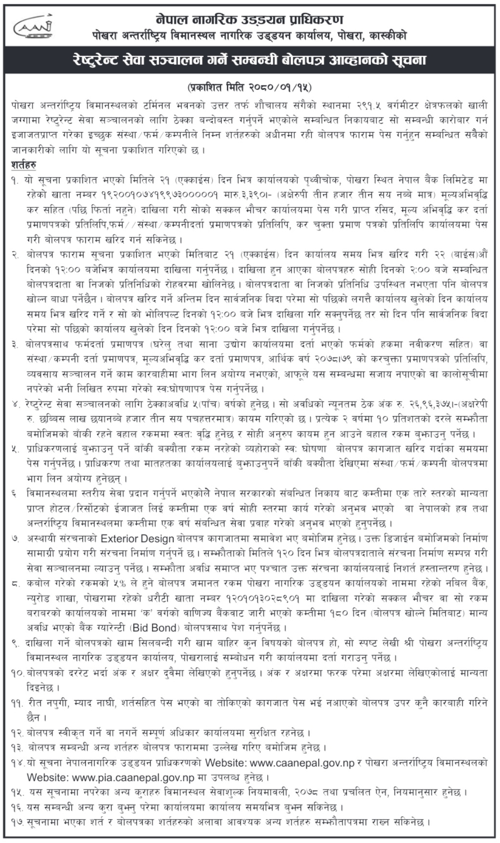 रेष्टुरेन्ट सेवा सञ्चालन गर्ने सम्बन्धी बोलपत्र आव्हानको सूचना