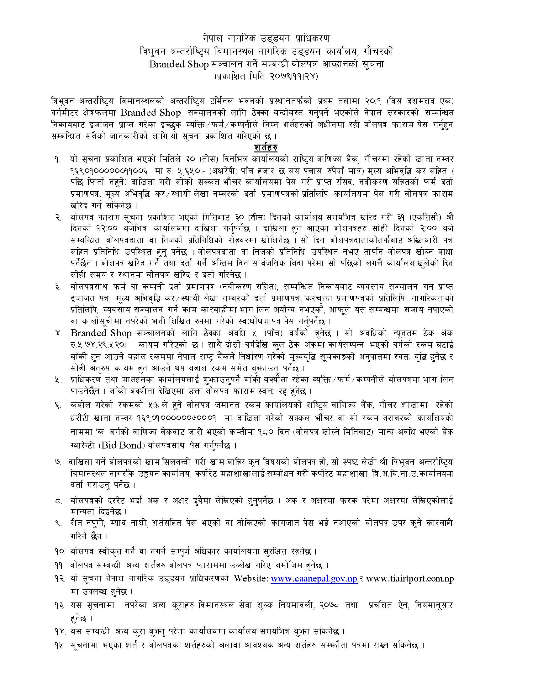 Branded Shop सञ्चालन गर्ने सम्बन्धी बोलपत्र आव्हानको सूचना