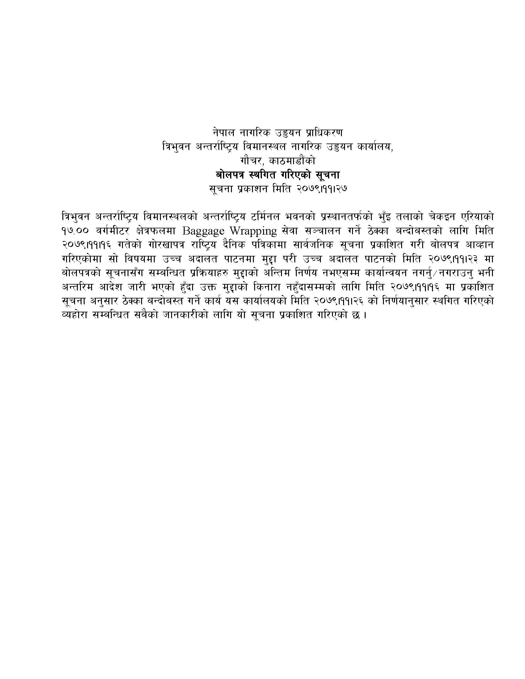 Baggage Wrapping को बोलपत्र स्थगित गरिएको सूचना