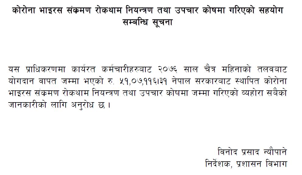 कोरोना भाइरस संक्रमण रोकथाम नियन्त्रण तथा उपचार कोषमा गरिएको सहयोग सम्बन्धि सूचना