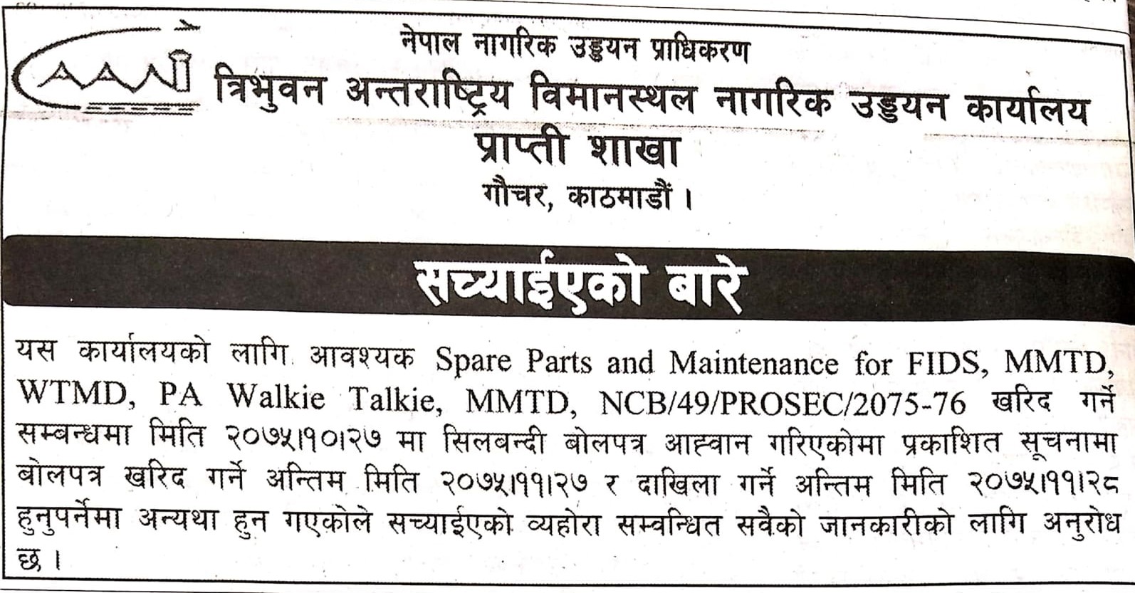 Correction for Bid Notice NCB/49/PROSEC/2075-76