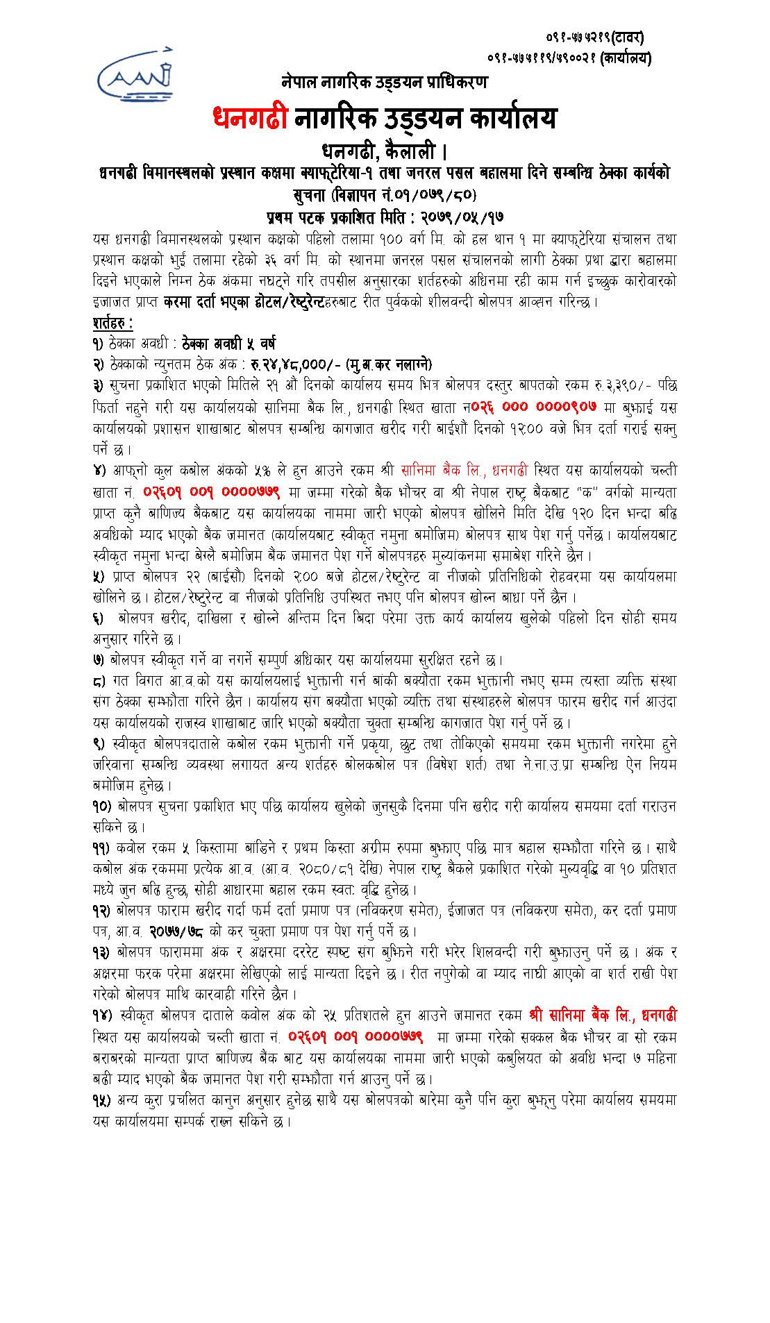धनगढी विमानस्थलको प्रस्थान कक्षमा क्याफ्टेरिया–१ तथा जनरल पसल बहालमा दिने सम्बन्धि ठेक्का कार्यको सुचना