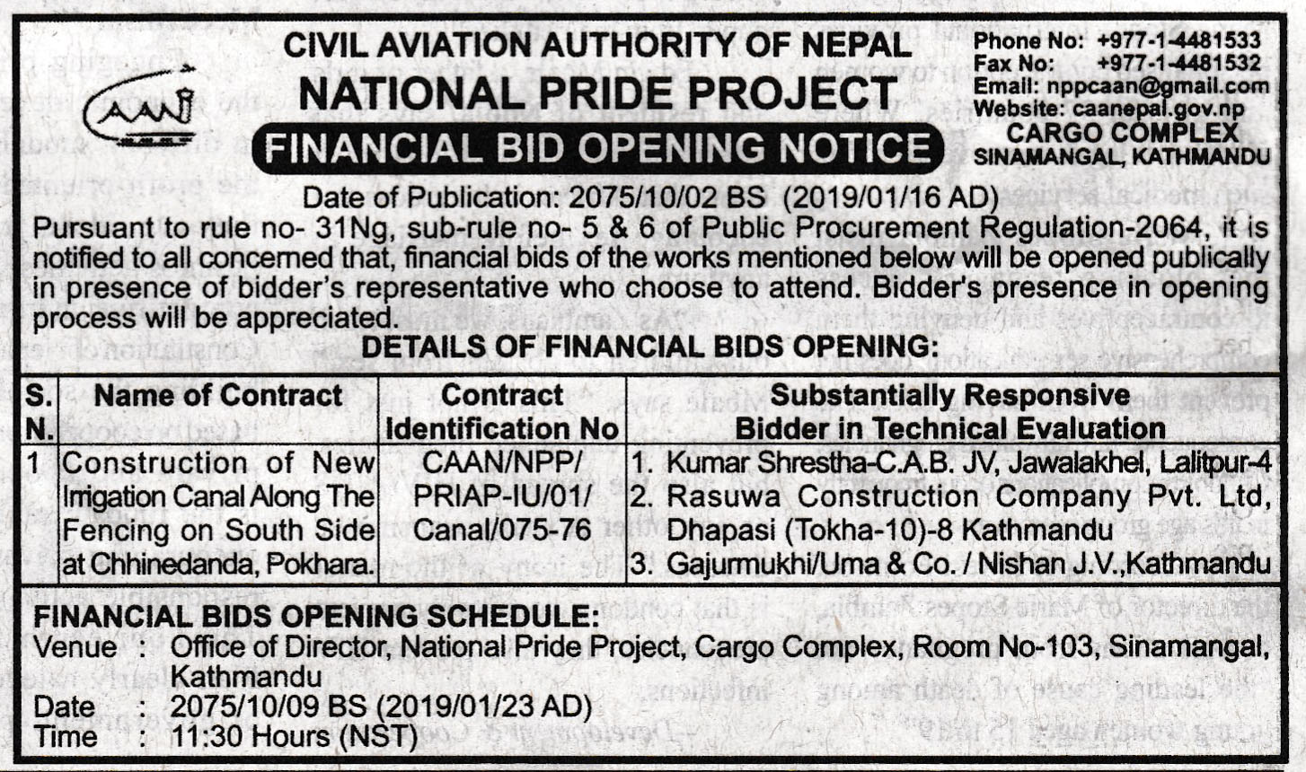 Financial Bid Opening Notice – CAAN/NPP/PRIAP-IU/01/Canal/075-76