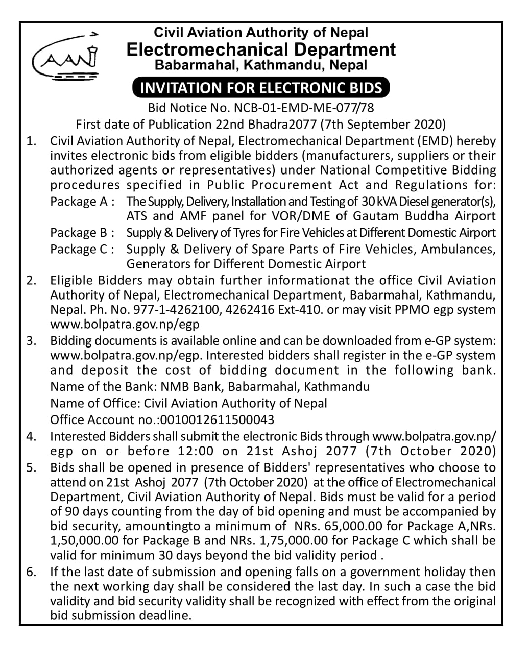 Invitaion for E-Bids NCB-01-EMD-ME-077/78