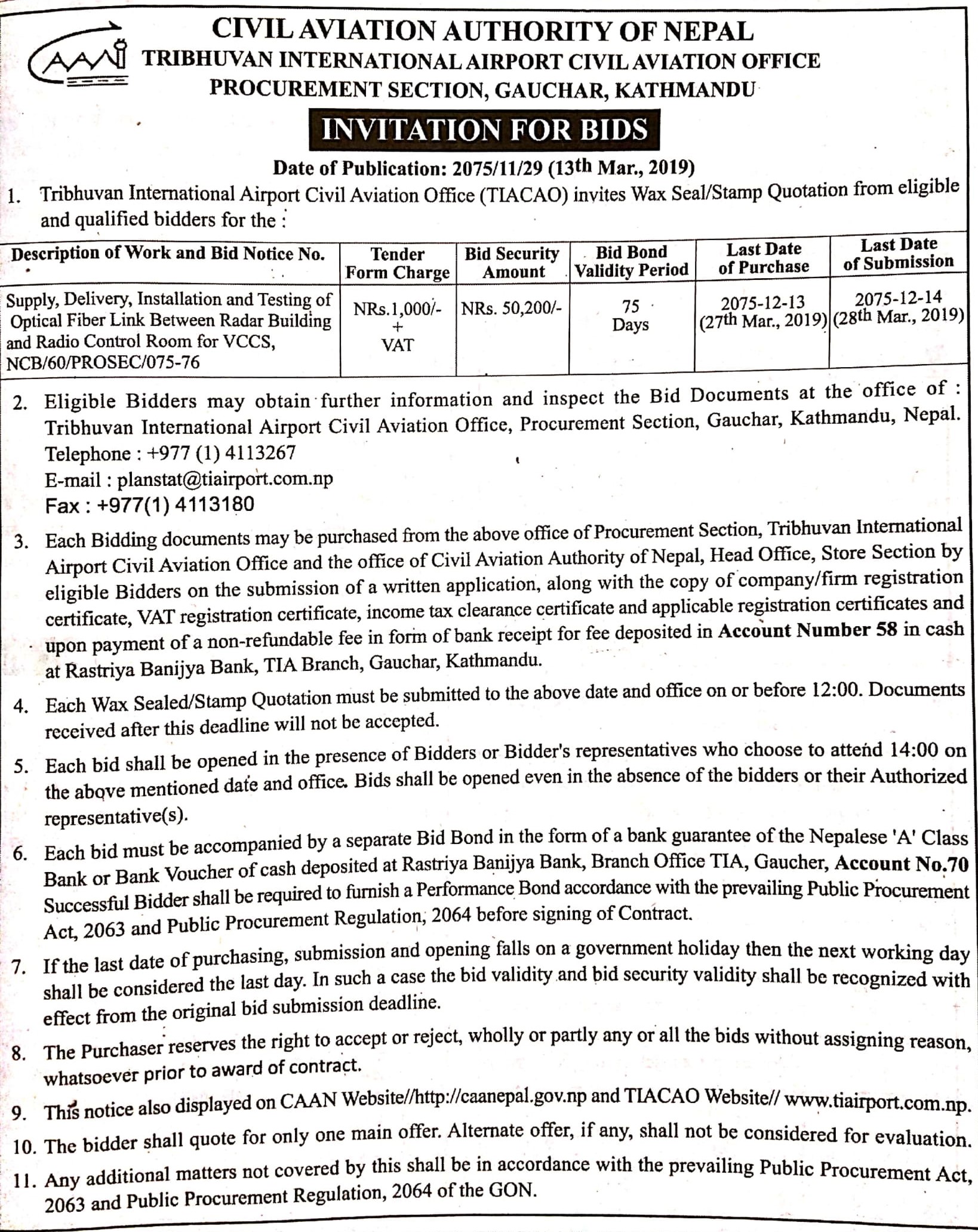 Invitation for Bids NCB/60/PROSEC/075-76