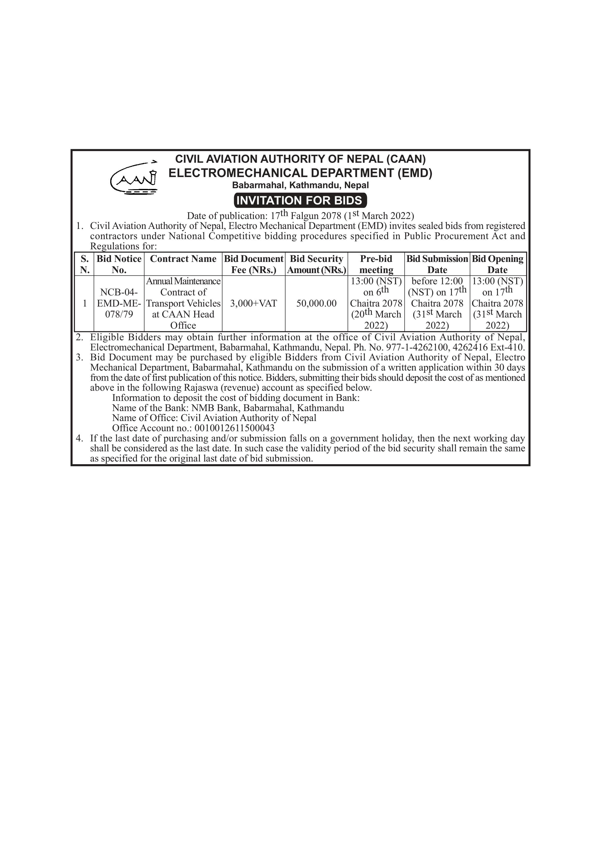 Invitation for Bids for Annual Maintenance of Transport Vehicles (NCB-04-EMD-ME-078/79)