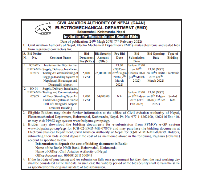 Invitation for E-Bids for Baggage Handling System & Air Condition System (ICB-02-EMD-ME-078/79 & SQ-01-EMD-ME-078/79)