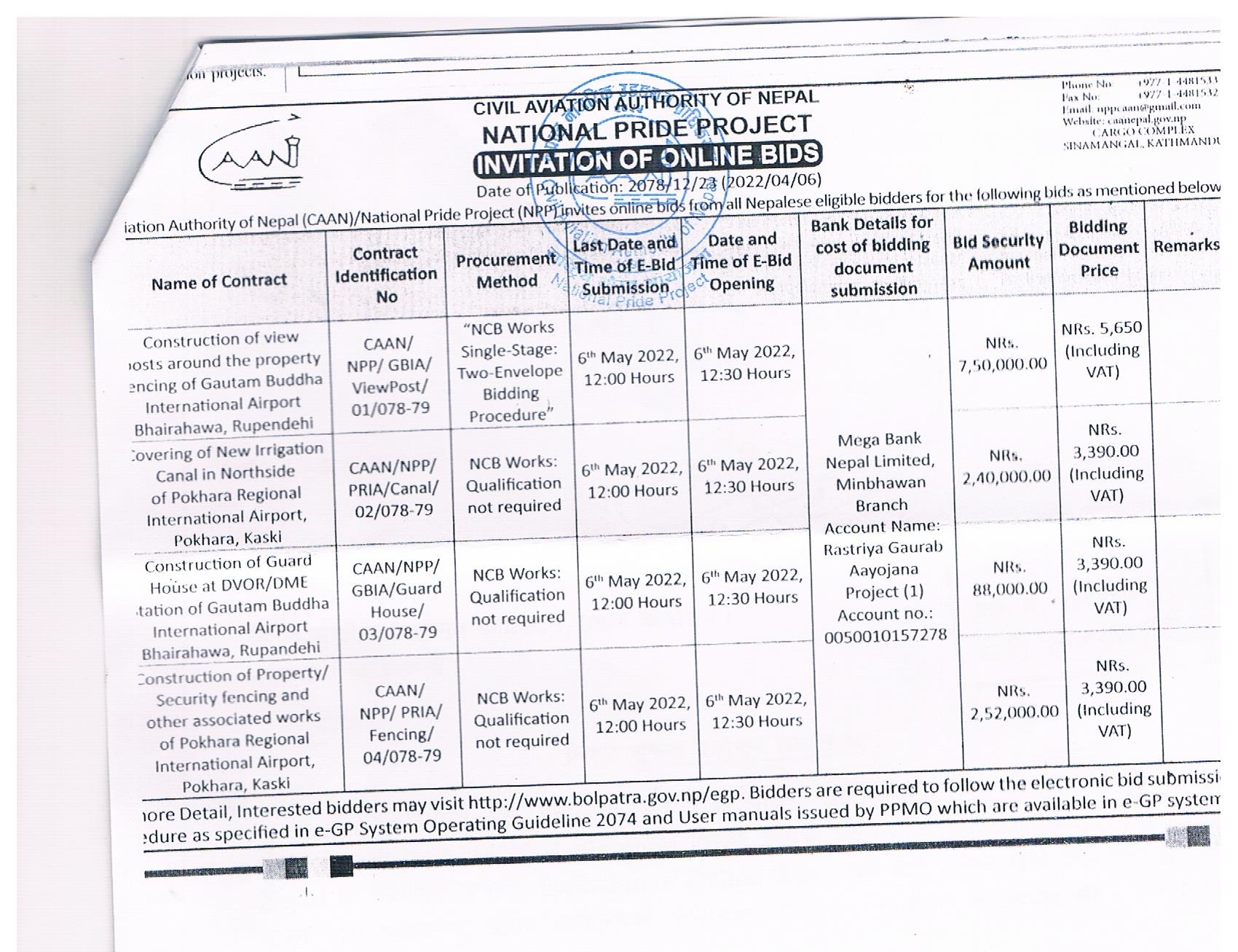 Invitation of Online BIds for Viewpost, Canal, Guard House, Fencing for PRIA and GBIA