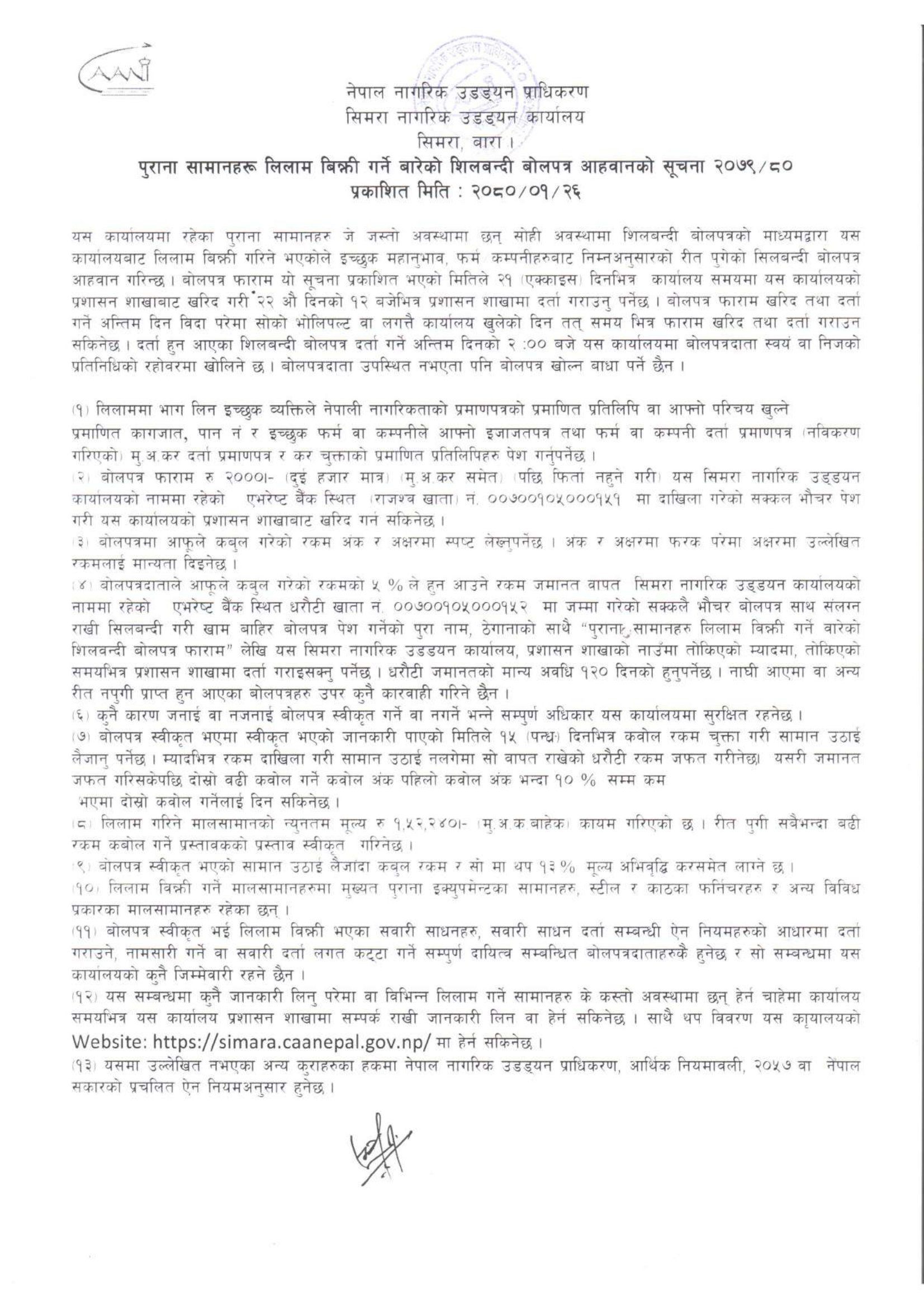 पुराना सामानहरु लिलाम बिक्री गर्ने बारेको शिलबन्दी बोलपत्र आहवानको सूचना(सिमरा ना. उ. का.)