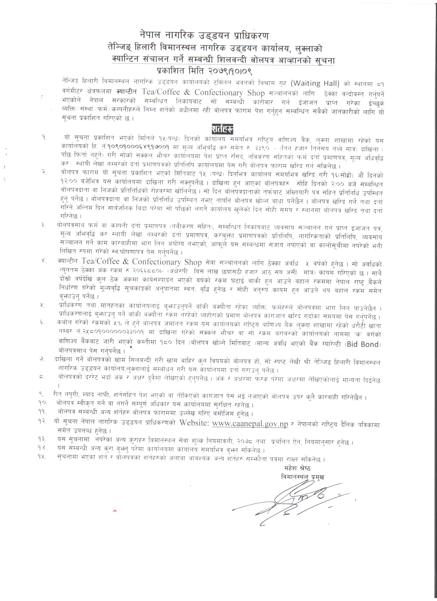 क्यान्टिन संचालन गर्ने सम्बन्धी शिलबन्धी बोलपत्र आव्हानको सूचना
