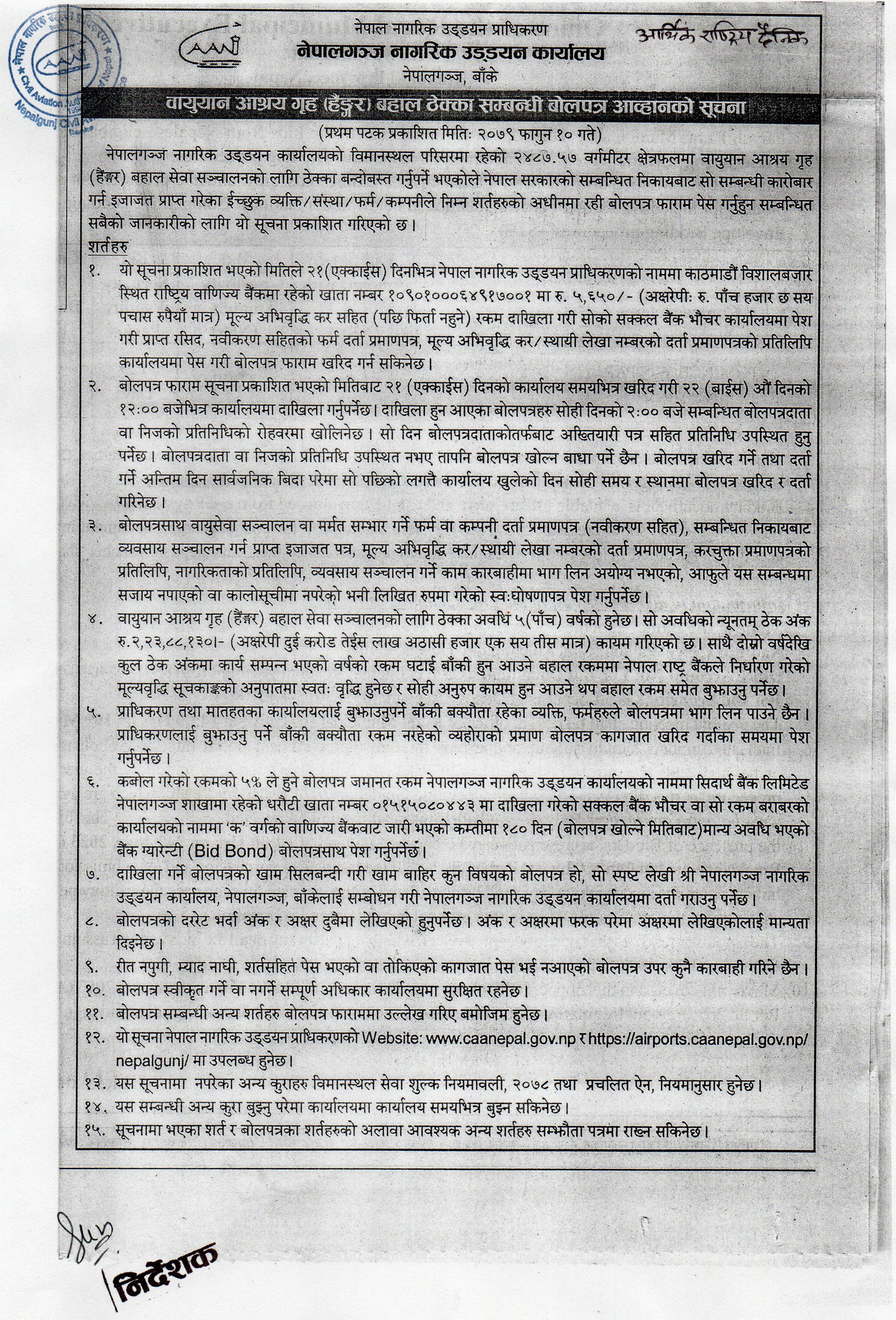 वायुयान आश्रय गृह (हैङ्गर) बहाल ठेक्का सम्बन्धी बोलपत्र आव्हानको सूचना