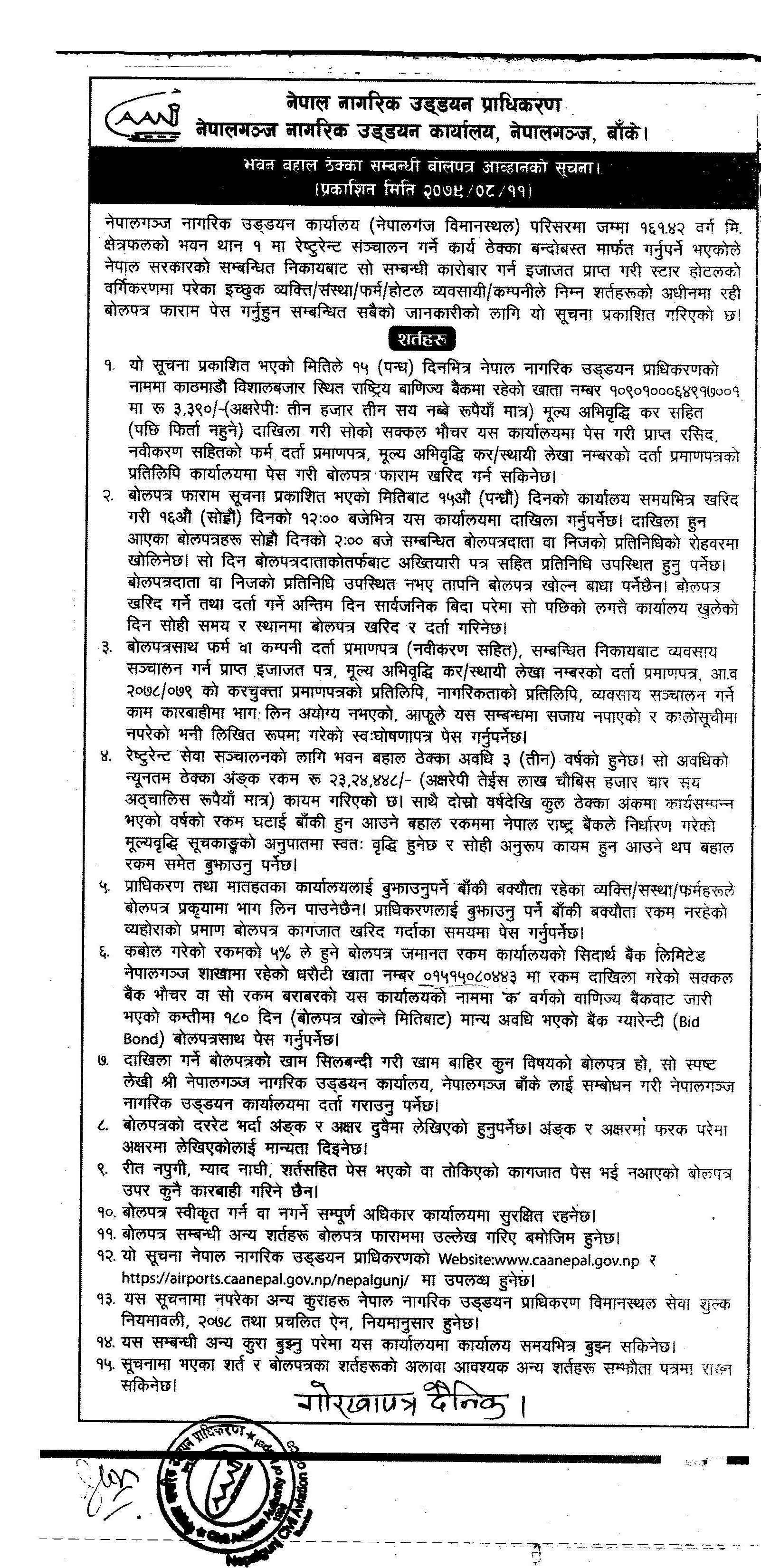 नेपालगञ्ज विमानस्थलमा रेष्टुरेन्ट सञ्चालन गर्न भवन बहाल ठेक्का सम्बन्धि बोलपत्र आब्हानको सूचना