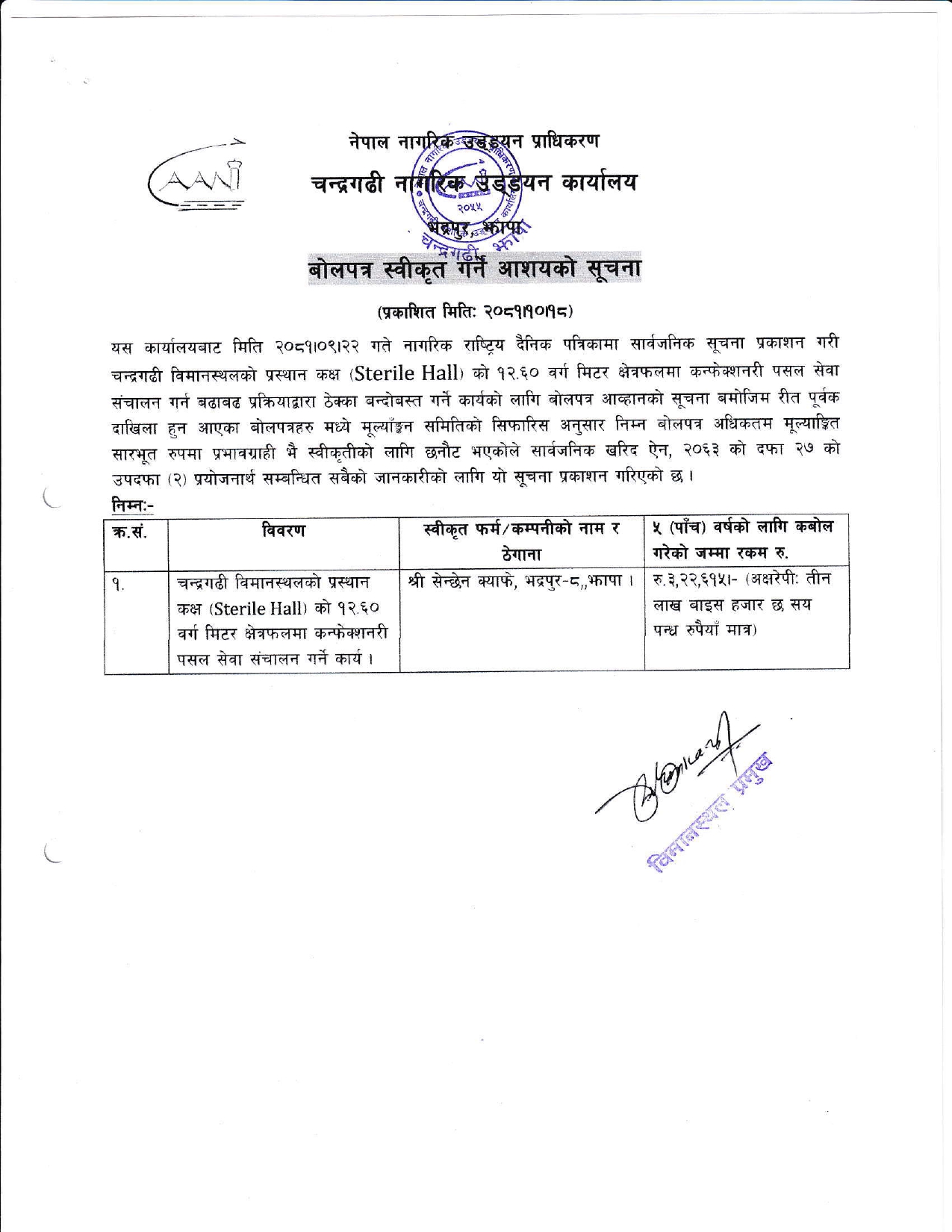 बोलपत्र स्वीकृत गर्ने आशयको सूचना (चन्द्रगढी ना.उ.का.)