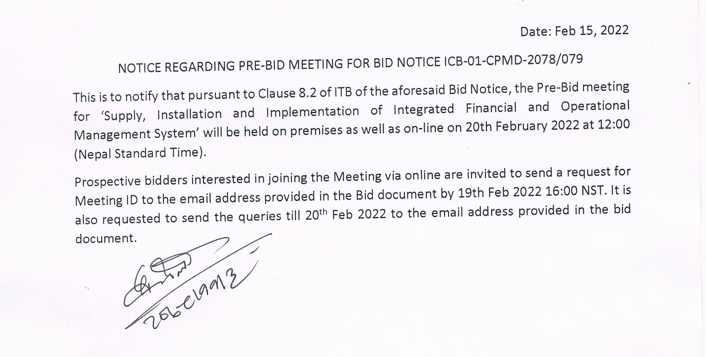 Notice regarding pre-bid meeting for bid notice ICB-01-CPMD-2078/079