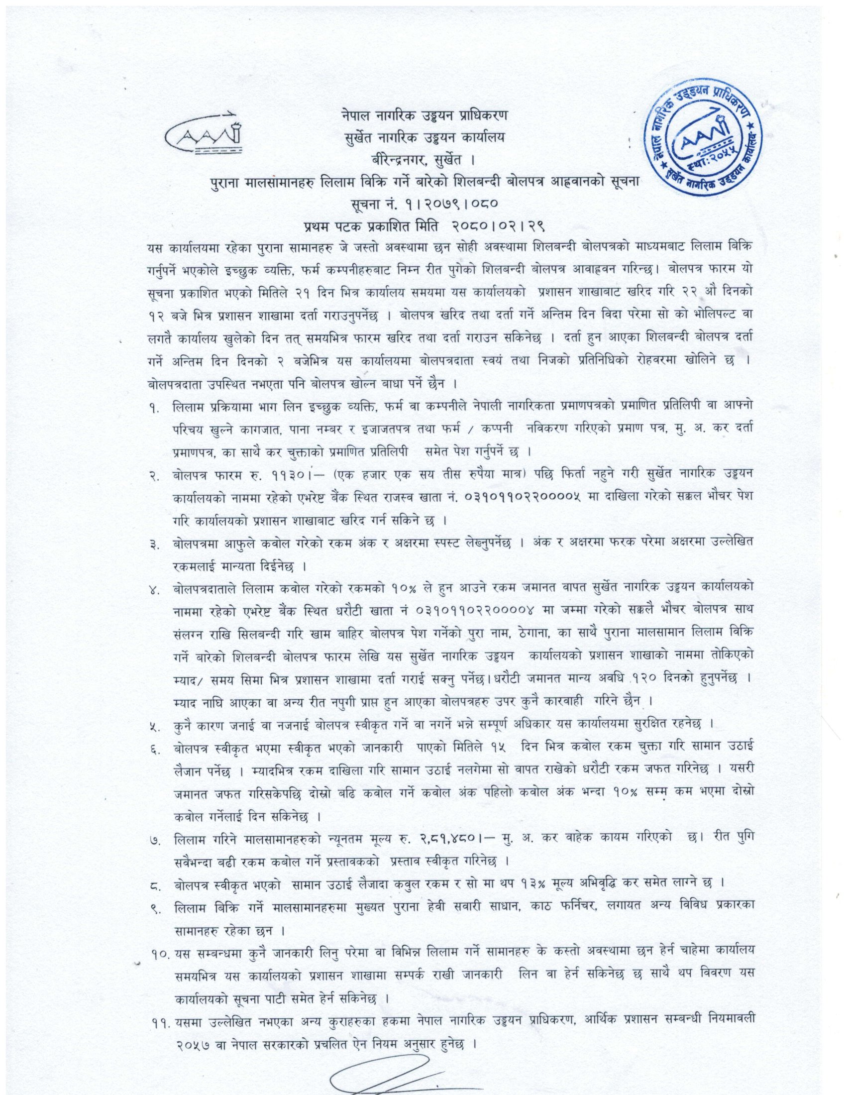 पुराना मालसामानहरु लिलाम बिक्रि गर्ने बारेको शिलबन्दी बोलपत्र आह्वानको सूचना