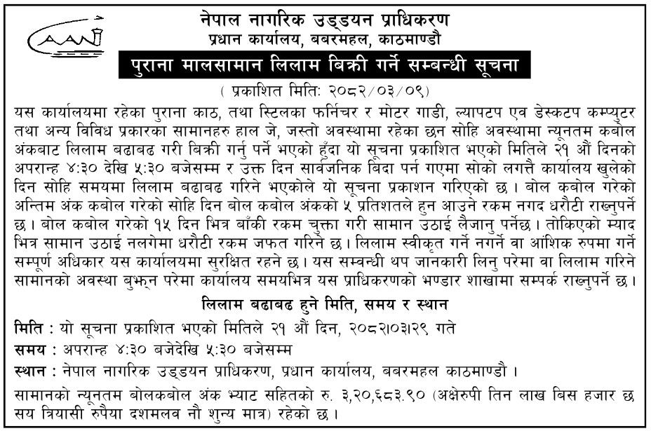 पुराना मालसामान लिलाम बिक्री गर्ने सम्बन्धी सूचना