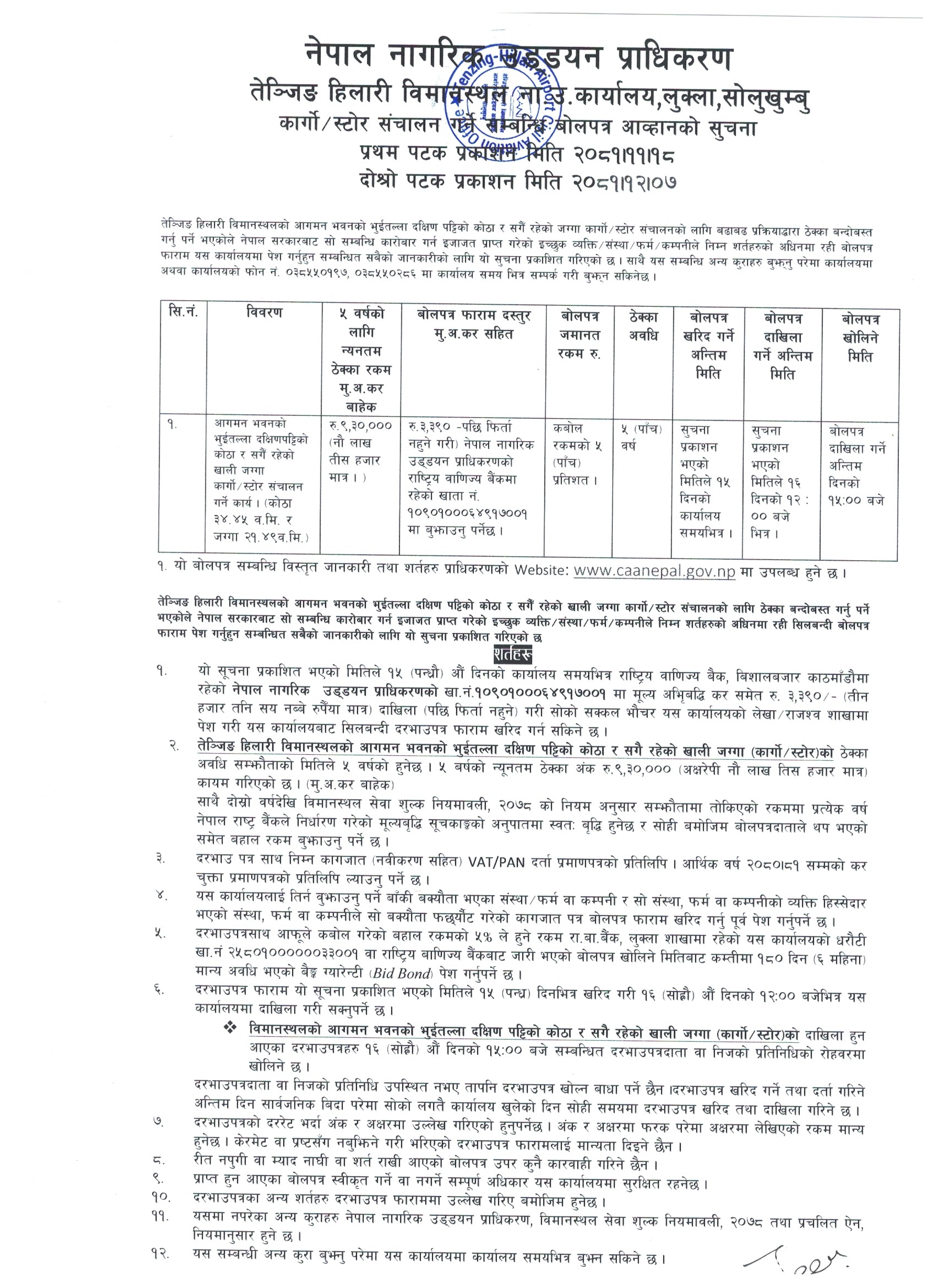 कार्गो/स्टोर संचालन गर्ने सम्बन्धी बोलपत्र आह्वानको सुचना (तेन्जिङ हिलारी ना.उ.का.)