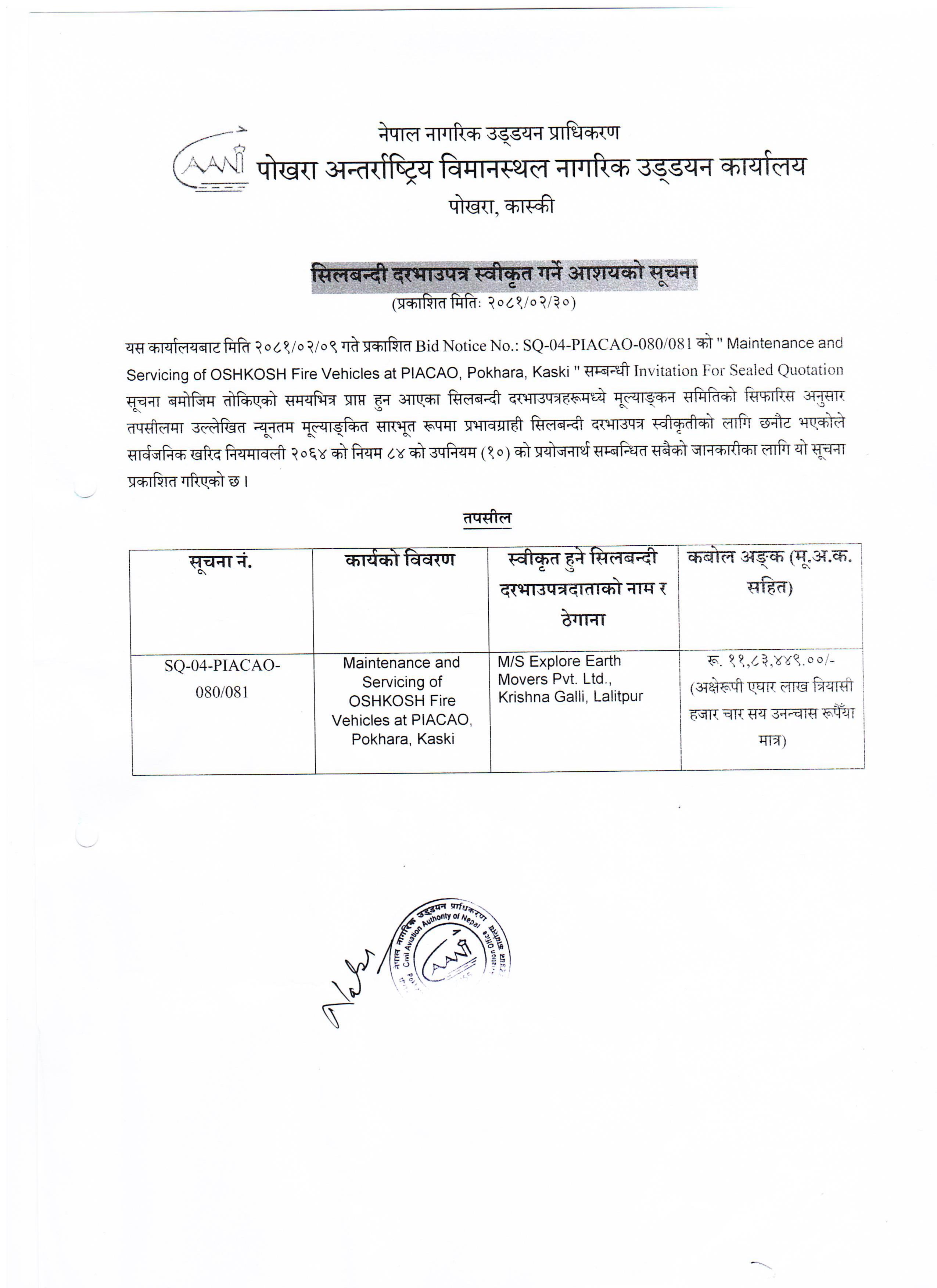 सिलबन्दी दरभाउपत्र स्वीकृत गर्ने आशयको सूचना (PIA)