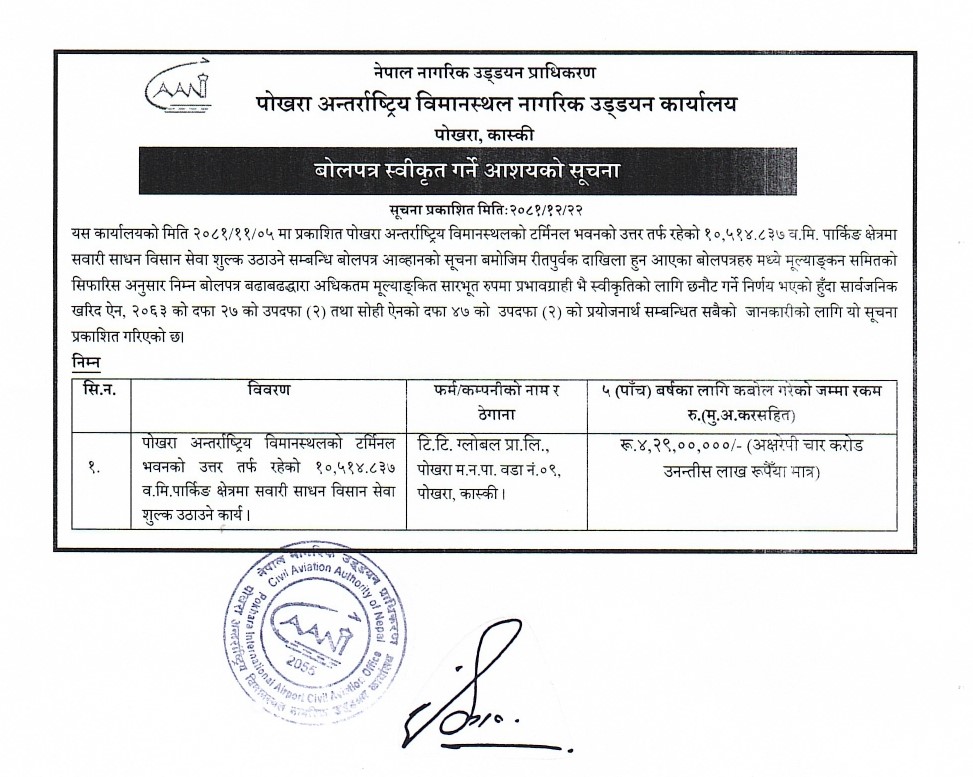 बोलपत्र स्वीकृत गर्ने आशयको सूचना-पार्किङ PIA