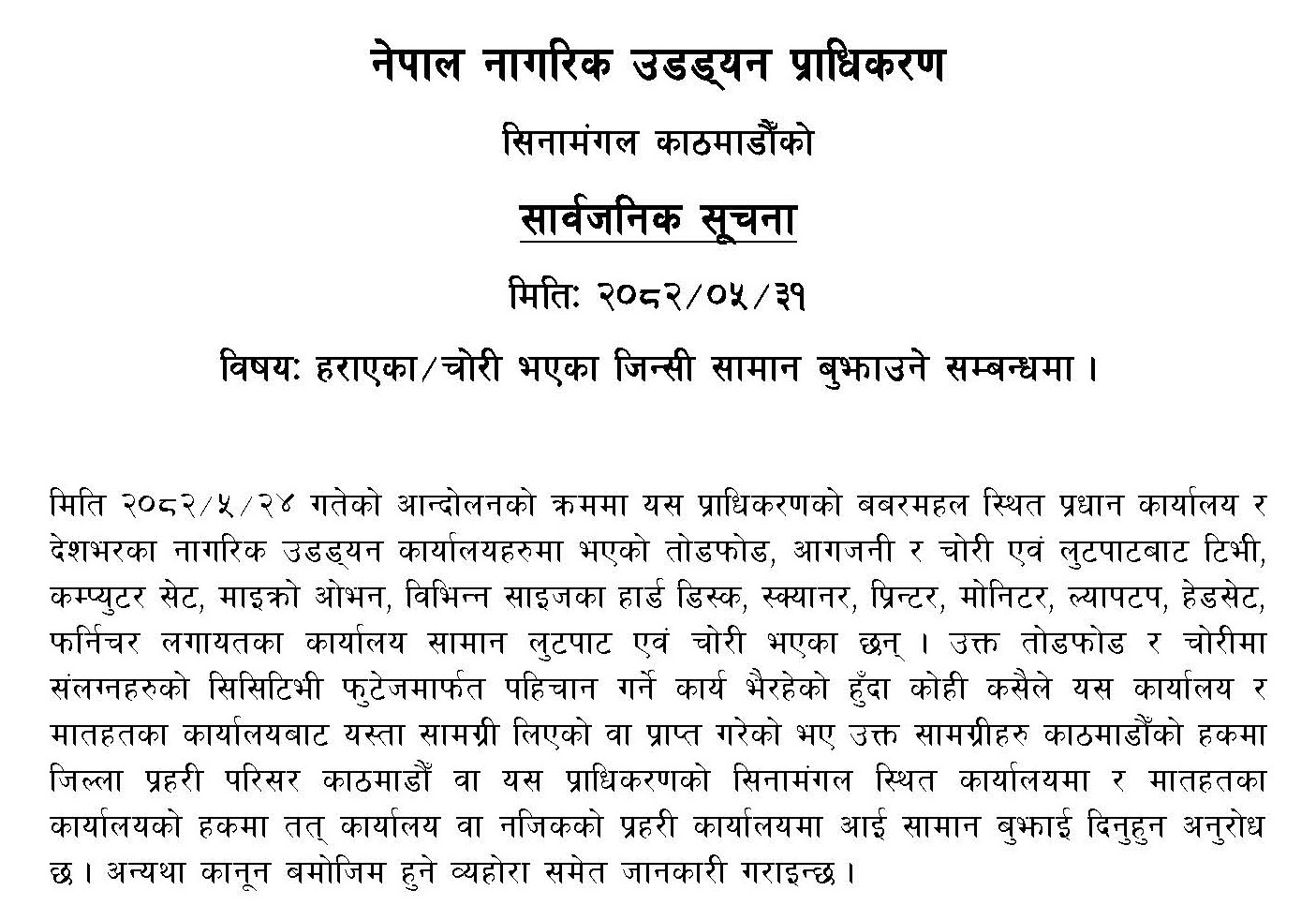 सार्वजनिक सूचना - हराएका/चोरी भएका जिन्सी सामान बुझाउने सम्बन्धमा