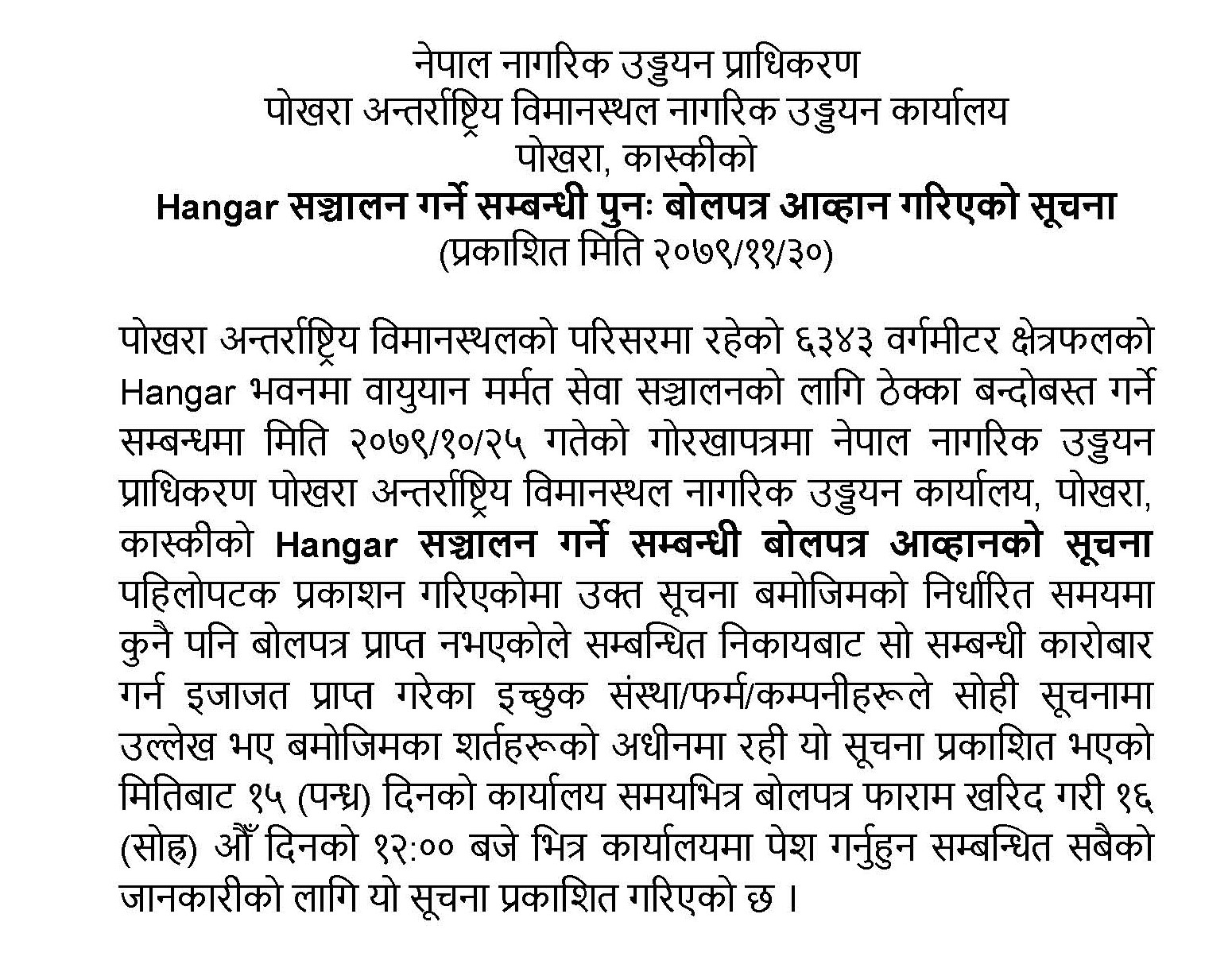 Hangar संचालन गर्ने सम्बन्धी पुनः बोलपत्र आव्हानको सूचना