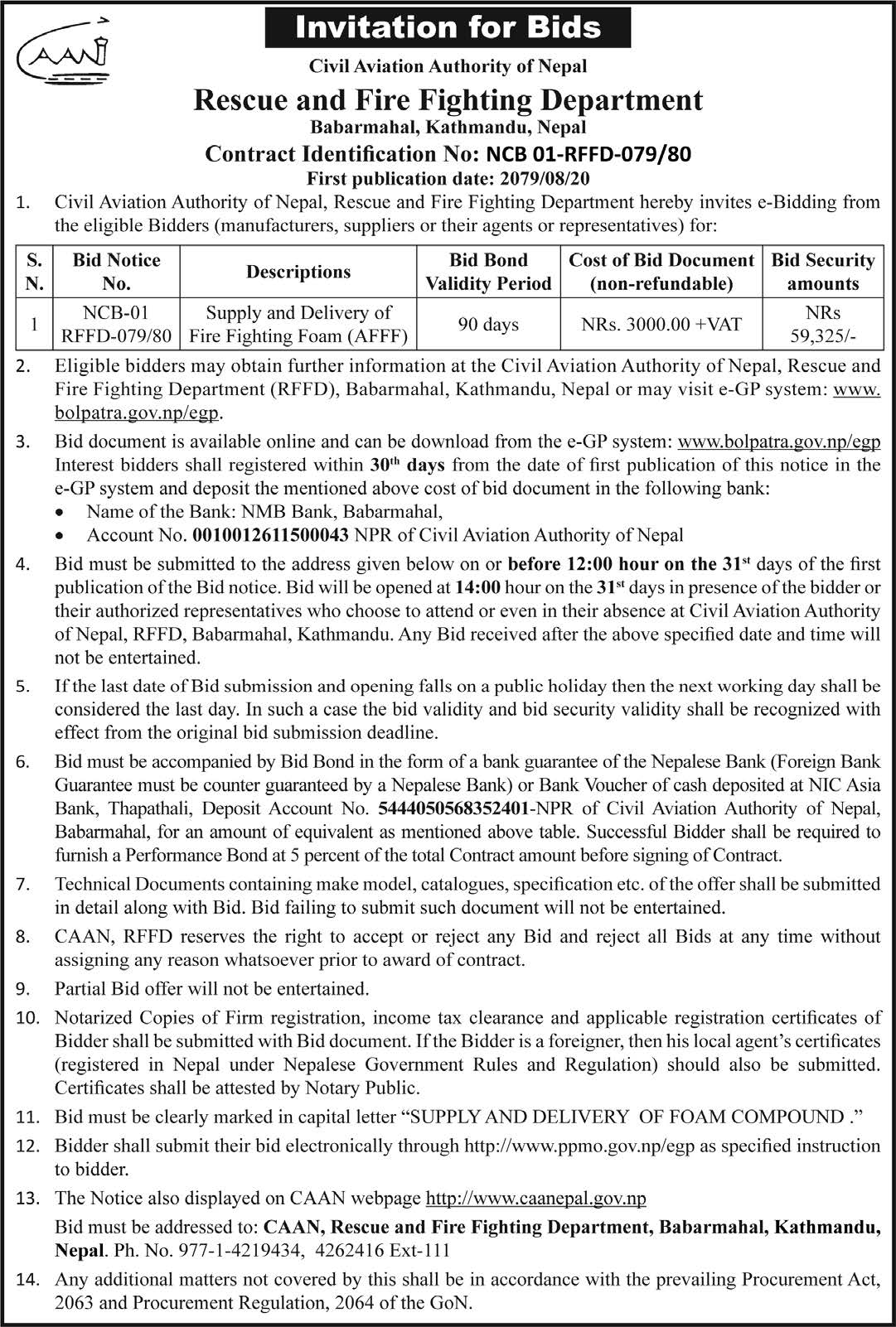 Supply and Delivery of Fire fighting Foam (AFFF) (NCB 01-RFFD-079/80)
