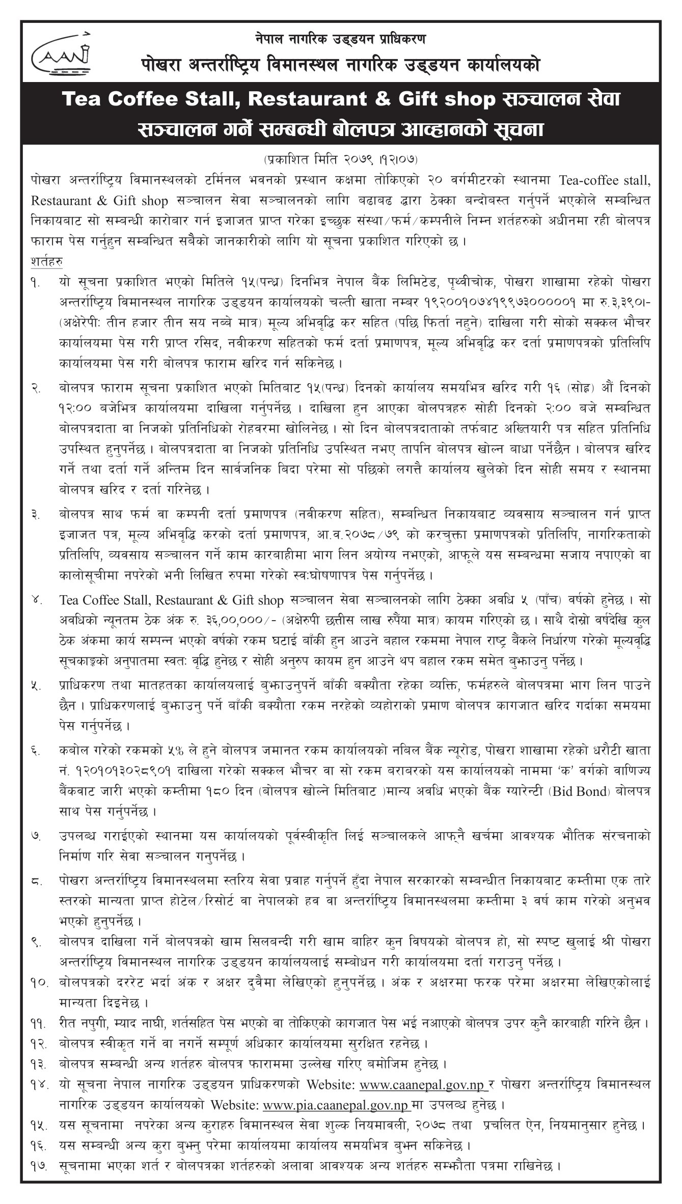 Tea Coffee Stall,Restaurant & Gift Shop सञ्चालन सेवा सञ्चालन गर्ने सम्बन्धी बोलपत्र आव्हानको सूचना
